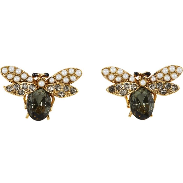 Make a beeline for these fabulously fashionable gold plated brass crystal and pearl bee stud earrings. Finely detailed, the exquisite faceted top cabochon gunmetal crystal body is enhanced with encrusted smoked crystal and faux pearl wings. Bold and 'make-you-smile' is the current on trend jewellery statement, and these adorable buzzy bee stud earrings are the perfect mood enhancer for everyday wear. This contemporary twist on the Victorians' love of insect jewellery makes a wonderfully charming gift for lovers of nature, avid gardeners, keen beekeepers, and fans of Victoriana.Â